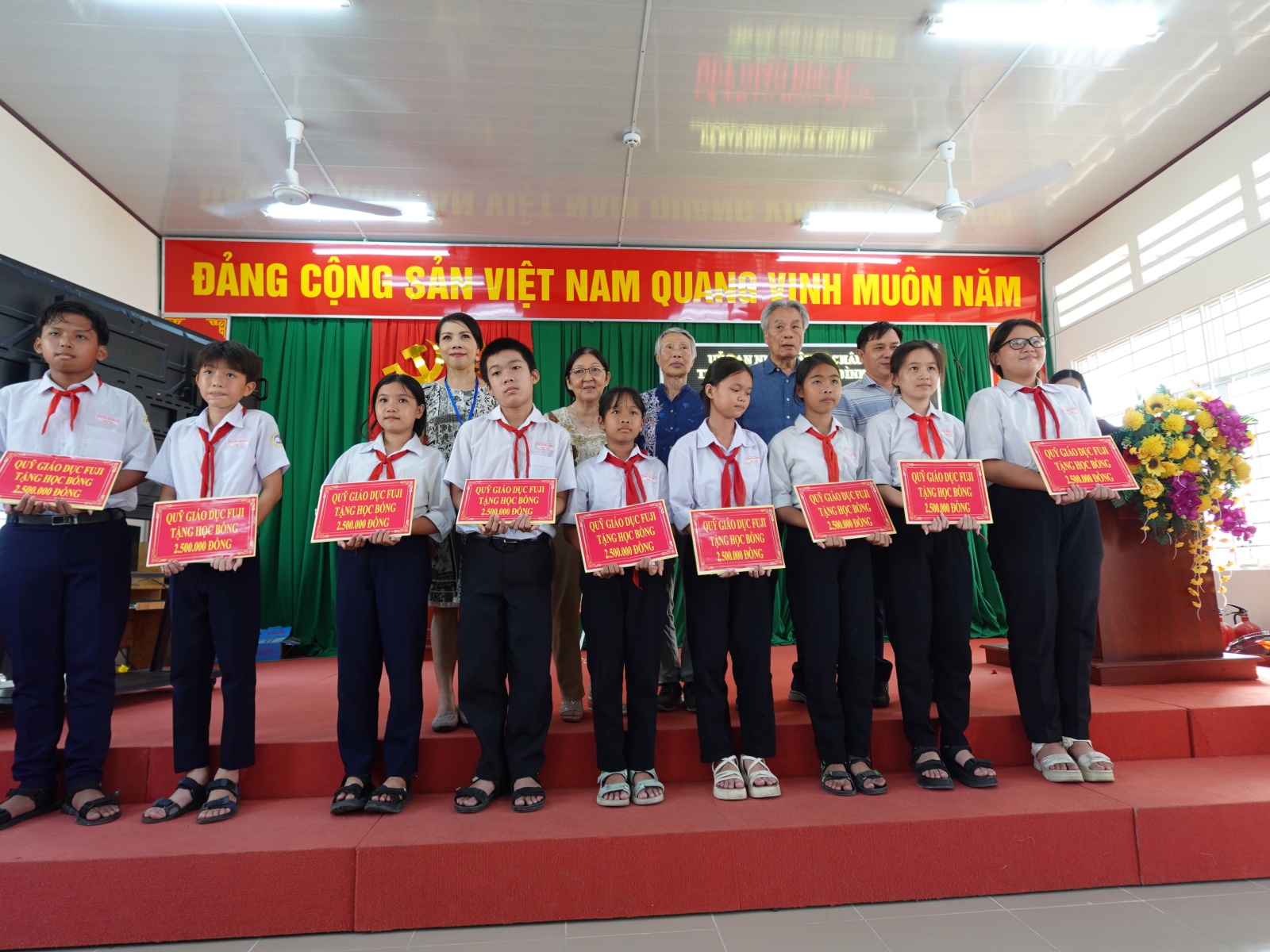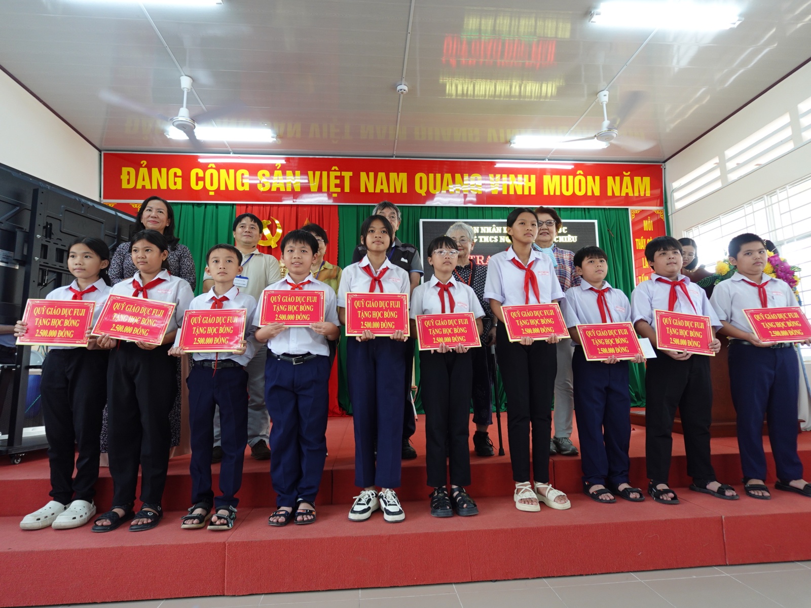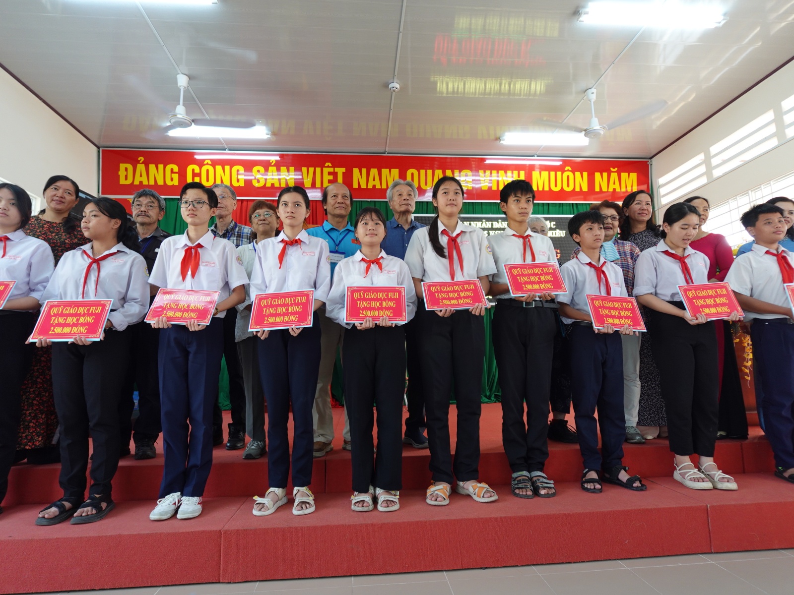 FUJI教育基金が、今年は80人の生徒に2億ベトナム・ドンの奨学金を贈ってくれたことは、生徒たちへの大きな助けです。FUJI教育基金は過去30年間、毎年継続して奨学金を贈ってくれ、チャウドックの生徒たちにとって大きな励ましとなりました。